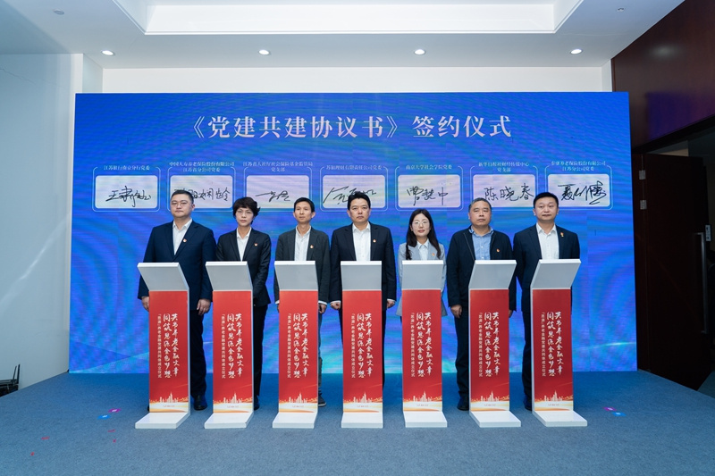 苏银理财有限责任公司、色情导航 、江苏省人社厅社会保险基金监管局、新华日报社财经传媒中心、中国人寿养老保险股份有限公司江苏省分公司、泰康养老保险股份有限公司江苏分公司、江苏银行南京分行七家成员单位代表上台签署《党建共同体共建协议书》。