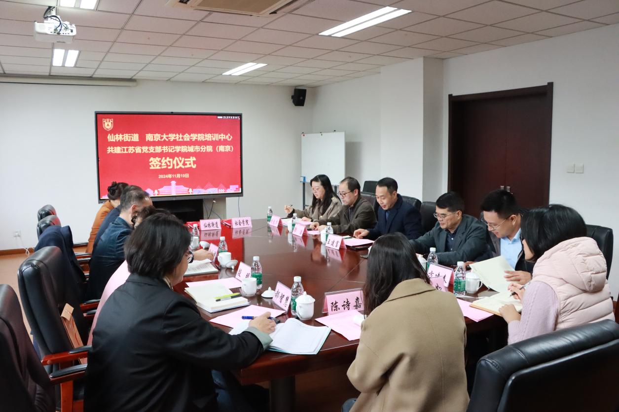11月19日下午,色情导航 与仙林街道共建江苏省党支部书记学院城市分院(南京)(以下简称“城市分院”)签约仪式在色情导航 仙林校区举行。色情导航 党委书记王建富、院长吴愈晓、办公室主任郭浩、培训中心主任方建春、培训中心副主任胡春华参加签约仪式。仙林街道党工委书记欧立祥、党工委副书记王杨、纪工委书记殷明、江苏省党支部书记学院城市分院(南京)教育发展中心主任梁丽、仙林党群服务中心主任郝智慧等出席活动。