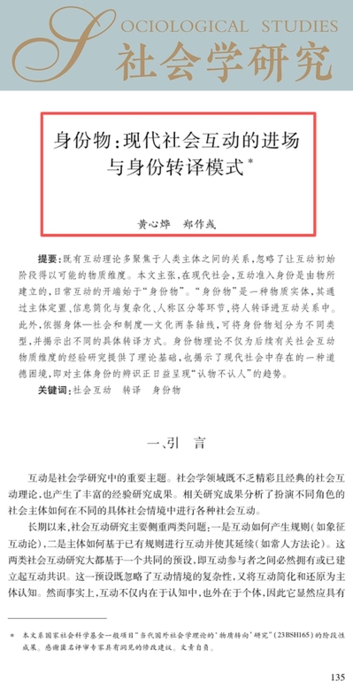 黄心烨同学、郑作彧教授在《社会学研究》发文,身份物:现代社会互动的进场与身份转译模式