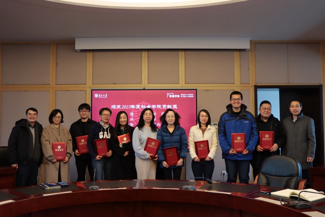2023年度贡献奖的颁奖仪式。王建富、吴愈晓为获奖的徐愫、田蓉、张洪、邱月、周培勤、柴向南、许琪、汪瑞、杨渝东、袁晶晶(排名不分先后)等10位老师颁发荣誉证书,表彰他们在学院教学科研、管理服务等方面作出的优秀典范。