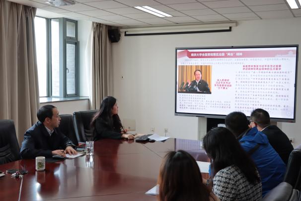 学院党委副书记、院长吴愈晓强调,党员干部要发挥先锋模范作用,带头积极学思践悟全国“两会”精神,结合学科特色,通过创新生态培育、人才队伍建设、创新平台打造等多方面入手,持续打造新质生产力,扎实推进南大社院的高质量发展。学院党委副书记沈晖,副院长陈家建、郭未、肖承丽以及社会学系教工党支部书记胡小武、社会工作与社会政策系教工党支部书记田蓉、心理系教工党支部书记李岩松、博士第二党支部书记马逸轩、学硕第三党支部书记赵文君等师生围绕两会内容和发展新质生产力展开热烈的交流讨论。