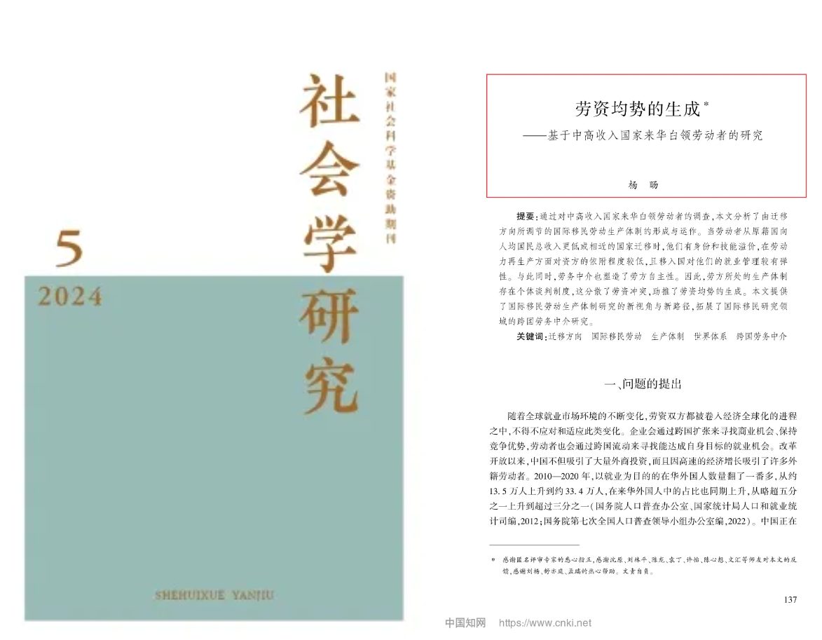 色情导航 杨旸助理研究员在《社会学研究》2024年第5期发表《劳资均势的生成——基于中高收入国家来华白领劳动者的研究》一文。