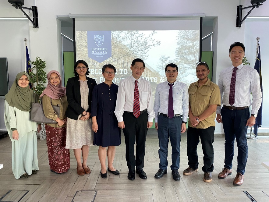 吴愈晓院长(右三)和马来亚大学人文与社会科学院黄子坚院长(右四)及其他人员