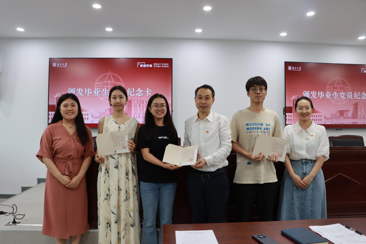 王建富、刘艺及张天泽为毕业生党员代表颁发毕业生党员纪念卡,勉励大家在新征程中继续发挥先锋模范作用。